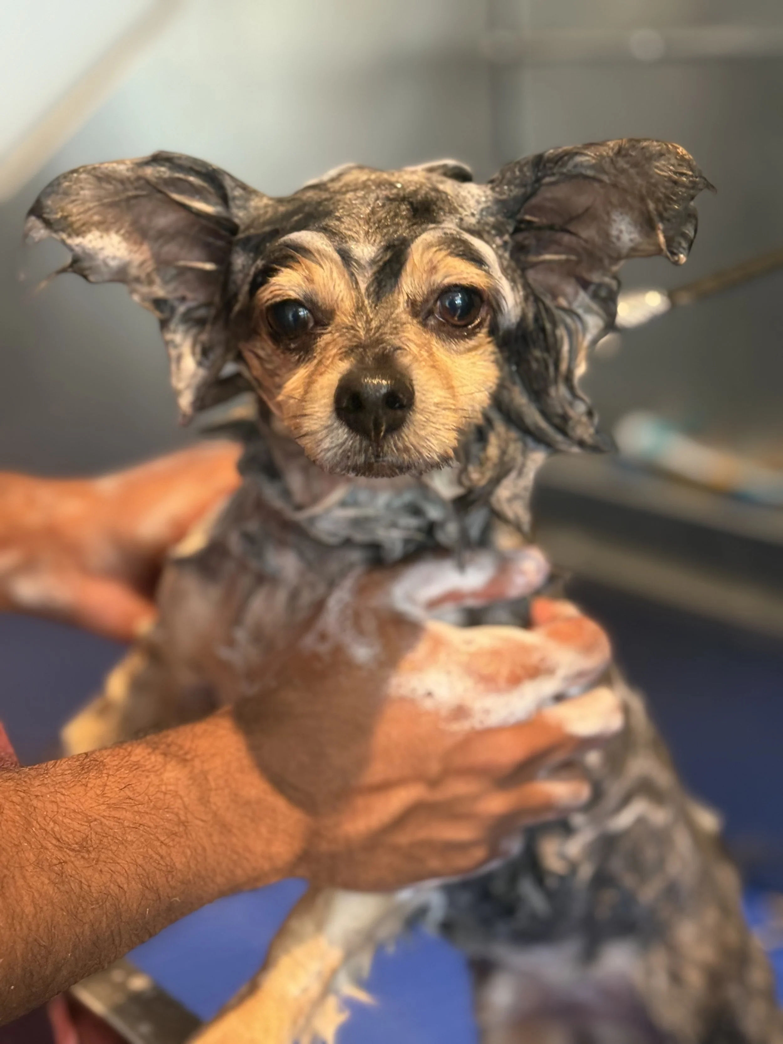 Available on wire or silky coated dogs, this specialty service helps maintain your dog’s coat texture + color. Hand stripping is usually done 1-4 times per year depending on the breed and desired look. $300 + up depending on breed and coat cycle.